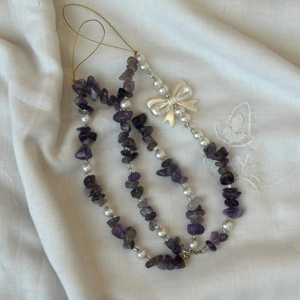 Elevate your accessory game with the Amethyst Charm Pearl Beaded Lanyard. Crafted with polished amethyst crystal chips, glossy pearl beads, and finished with a dainty bow charm, this piece blends elegance and whimsy. Whether you use it as a phone strap, key holder, or statement accessory, it adds a touch of magic to your everyday look.